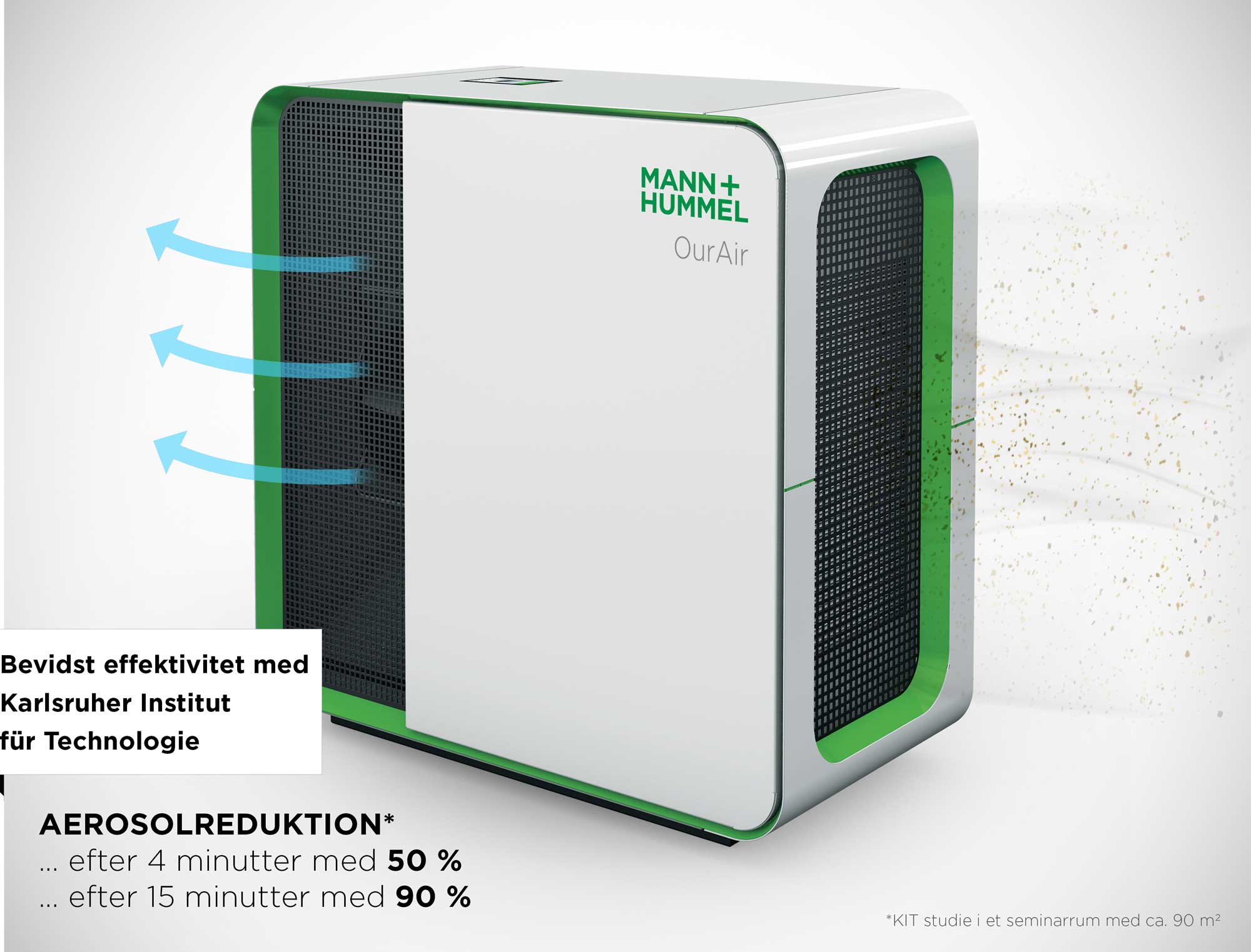 KIT (Karlsruhe Institute of Technology) har gennemført flere studier og har bekræftet, at OurAir TK 850 (tidligere model af OurAir SQ 1750) og OurAir SQ 2500 rumluftrenserne reducerer antallet af partikler i rummet markant og derfor bidrager til at reducere risikoen for infektion. Læs mere om de videnskabelige studier.